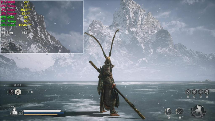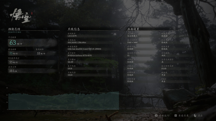 2K分辨率+影视级画质+超高光线追踪+DLSS均衡+帧生成,《黑神话:悟空》Benchmark测试平均帧数63,最高帧数75;游戏内帧数基本能维持在70左右。