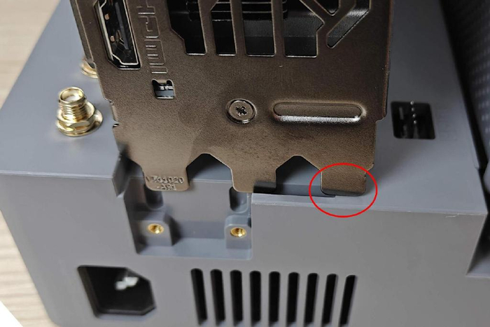 计划使用RTX 4070Ti SUPER及以上的显卡的小伙伴要注意了,如果你的显卡装在台式机里需要3个槽位,那你的显卡挡板大概率会比扩展坞预留的插槽宽5mm,插不进去就不能安装显卡。我已经把这个问题反馈给了零刻客服,后续应该会解决这个问题。