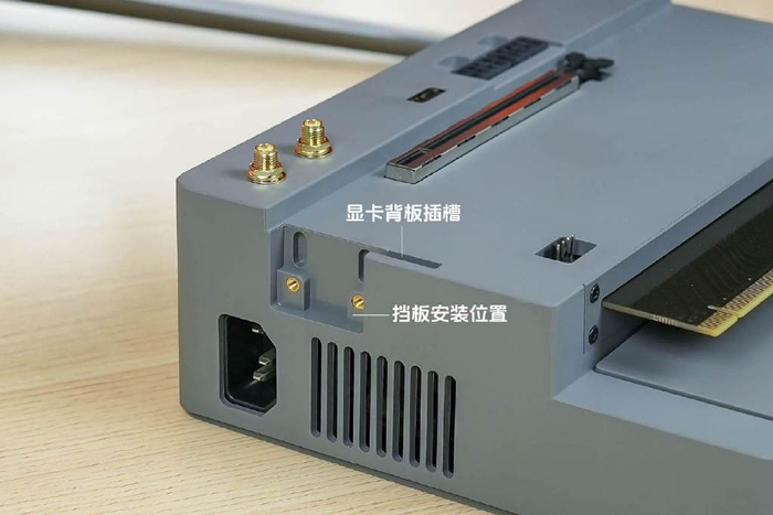 先把显卡挡板固定到EX显卡扩展坞,将显卡插入PCIe 4.0x8插槽并固定到挡板上,接上显卡电源线即可。