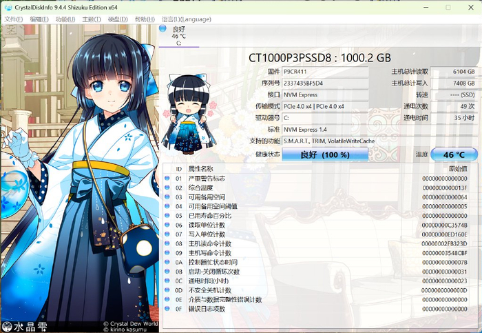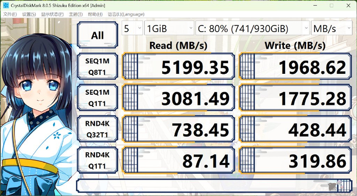 硬盘是英睿达P3 1TB PCIe 4.0x4 SSD,CrystalDiskMark测试顺序读取速度5199MB/s,顺序写入速度3081MB/s。