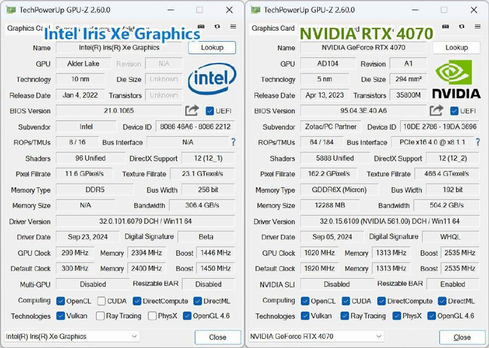 外接显卡主要是提升迷你电脑的显卡性能,从而提升整机的游戏、生产力等应用体验。零刻GTi12 Ultrra搭载第12代英特尔酷睿i9-12900H处理器,核显是Intel Iris Xe Graphics eligible,外接显卡是索泰RTX 4070 AMP AIRO SPIDERMAN,参数方面的对比在这里就不再过多赘述了,大家可以参考下面这组图。