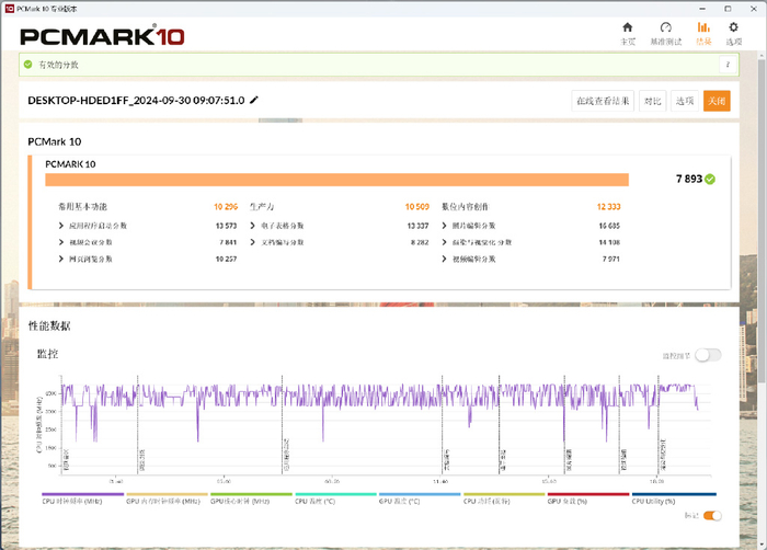 PCMark 10的测试项目几乎涵盖了现代办公中的所需要的所有应用场景,测试工作负载包括:网页浏览、视频会议和应用程序启动、文档编写、图片编辑、视频剪辑和渲染等。零刻GTi12 Ultrra综合得分7893,其中,常用基本功能10296,生产力10509,数位内容创作12333。