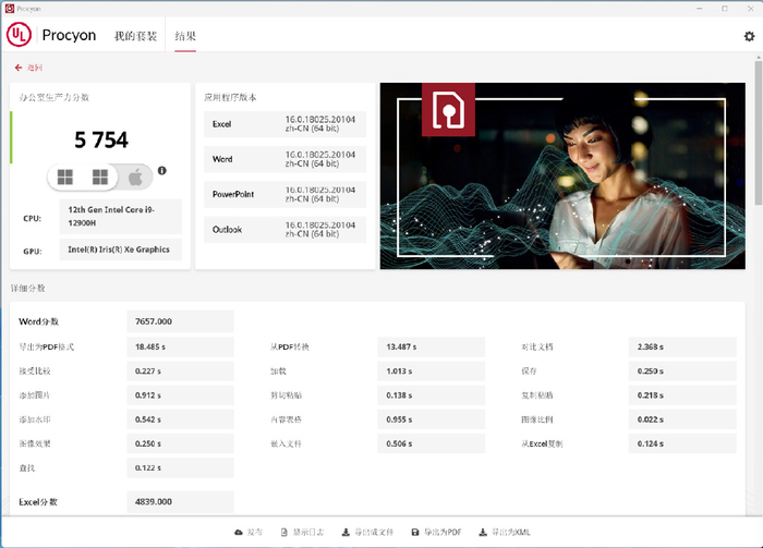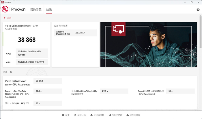 为了获取更精准的生产力表现,我使用UL Procyon对几款典型的Adobe软件进行了更专业的性能测试,通过最后的分数量化电脑在执行编辑、导出任务时速度。