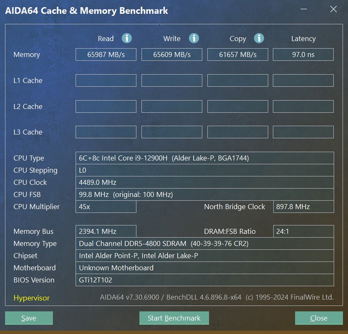 内存是英睿达32GB(16GBx2)5600MHz双通道 DDR5内存,不过i9-12900H最高只支持4800MHz DDR5内存。AIDA64内存性能测试结果:读速65987MB/s,写速65609MB/s,拷贝61657MB/s,延迟97ns。