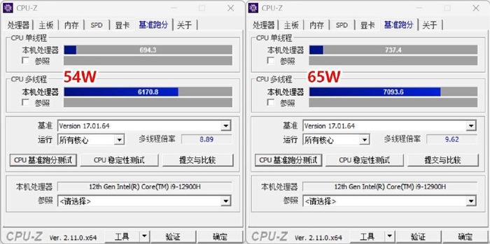 - TDP 54W:单线程得分694.3分,多线程得分6170.8分。