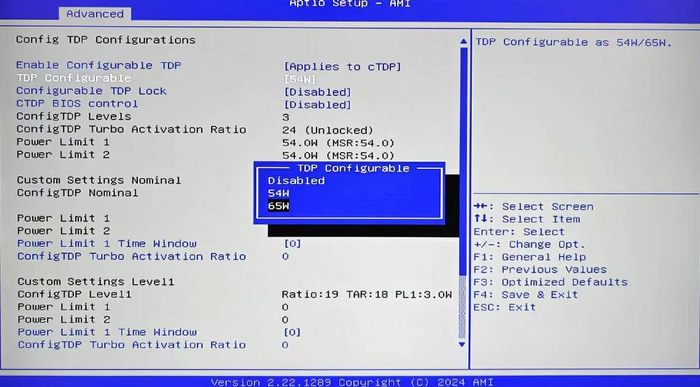 操作路径:开机出现零刻LOGO时按Del键进入BIOS,【Advanced】-【Power & Performance】-【CPU Power Management Control】-【Config TDP Configurations】-【TDP Configurable】-选择【65W】-按F4保存设置。