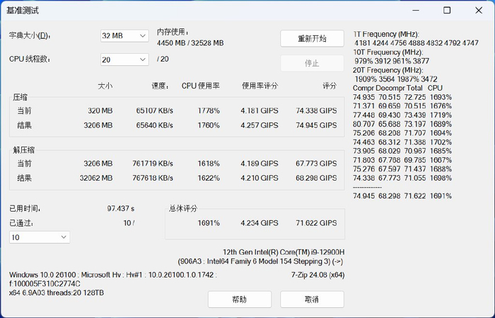 - 7zip解压缩测试结果:71.622 GIPS