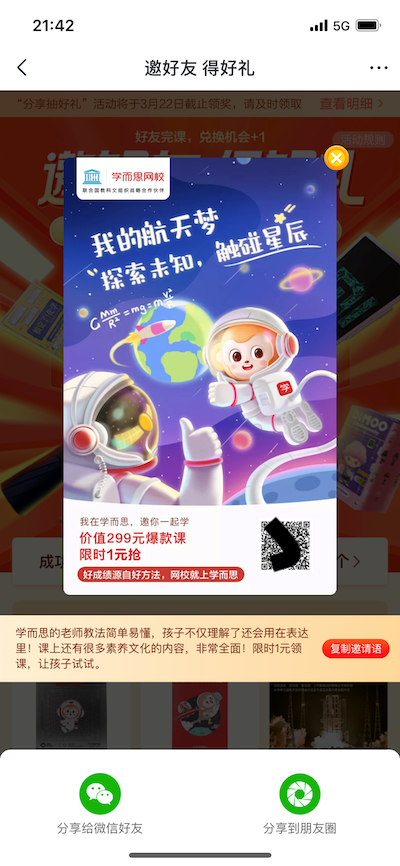 奖励均为实物奖品,且多与孩子学习有关,对家长/学生有一定吸引力;点击直接弹出海报、话术,分享难度低。