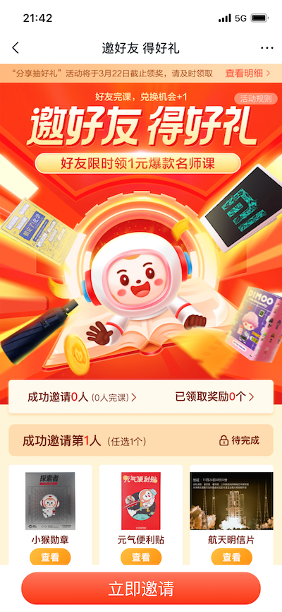 活动设置了阶梯奖励机制,每成功邀请1位用户(1元购课并完课),可领取1个礼品,最多可领5个礼品。