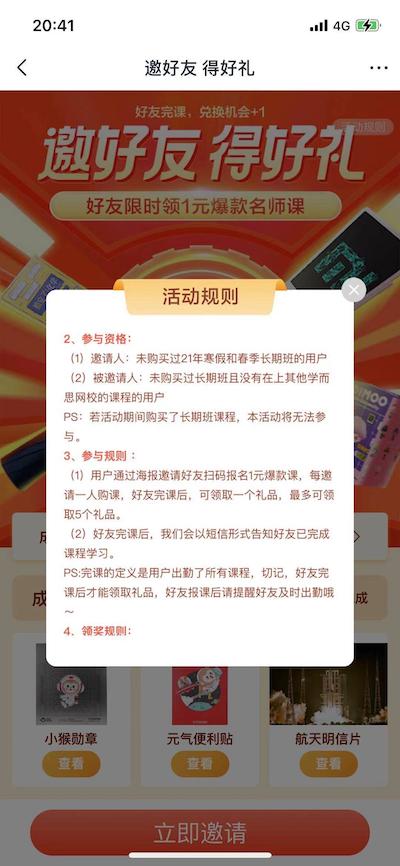 总结:该活动分享流程简洁,被邀请者完成支付流程较长,可能会有一定量流失;好友完课后才算作成功邀请,周期较长。