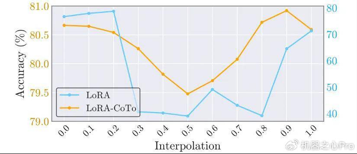- 线性插值准确率:在常识推理与图像分类任务中,对两个独立训练的 LoRA 模型进行线性插值时,标准 LoRA 的性能在融合点 (λ=0.5) 会急剧下降。相比之下,CoTo 模型展现了优越的线性模式连通性 (LMC),在整个插值路径上均能保持平滑且高效的性能过渡。