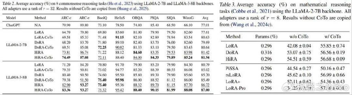 - 性能更强:在涵盖视觉(11 个图像分类任务)、语言(8 个常识推理任务)和数学推理等多个领域的基准测试中,CoTo 都能稳定地提升包括 LoRA、DoRA、HiRA 在内的多种 LoRA 变体的性能。
