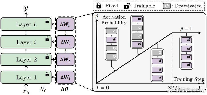 - 训练中后期:线性地提高适配器的激活概率,直到所有适配器都完全参与训练,回归到标准的微调模式。