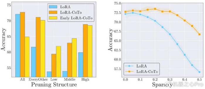 CoTo 的训练方式天然地增强了模型的剪枝容错能力。如下图所示,无论是在移除交替层、底层、中层还是高层适配器的结构化剪枝中,还是在不同稀疏度的非结构化剪枝中,CoTo-LoRA 的性能都全面超越了标准 LoRA。