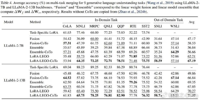 - 多任务 LoRA 融合:在 GLUE 数据集上,无论是基于 LLaMA-2 (7B, 13B) 还是 DeBERTa-v3 模型,通过 CoTo 训练的 LoRA 模块在进行多任务合并时,其准确率均稳定超越了使用常规训练方法融合的基线模型。