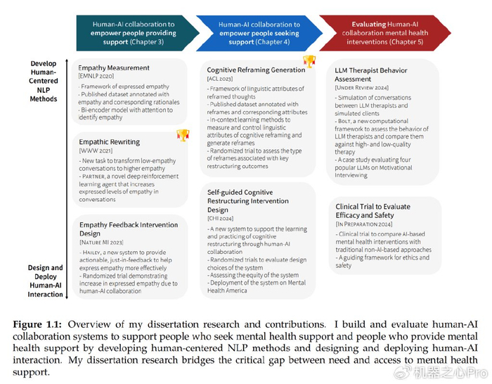 作者在论文中描述了他开发的两个支持心理健康和福祉的人机协作系统,以及此类系统的评估框架。这项研究让人和 AI 能够协作,既帮助需要心理支持的人掌握应对技巧,也辅助专业人员提升辅导能力。