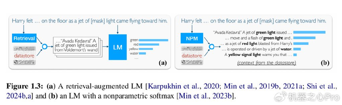 接下来,作者介绍了一类新型的语言模型 —— 非参数( Nonparametric )语言模型,这类模型将训练数据重新用作数据存储,从中检索信息以提高准确性和可更新性。