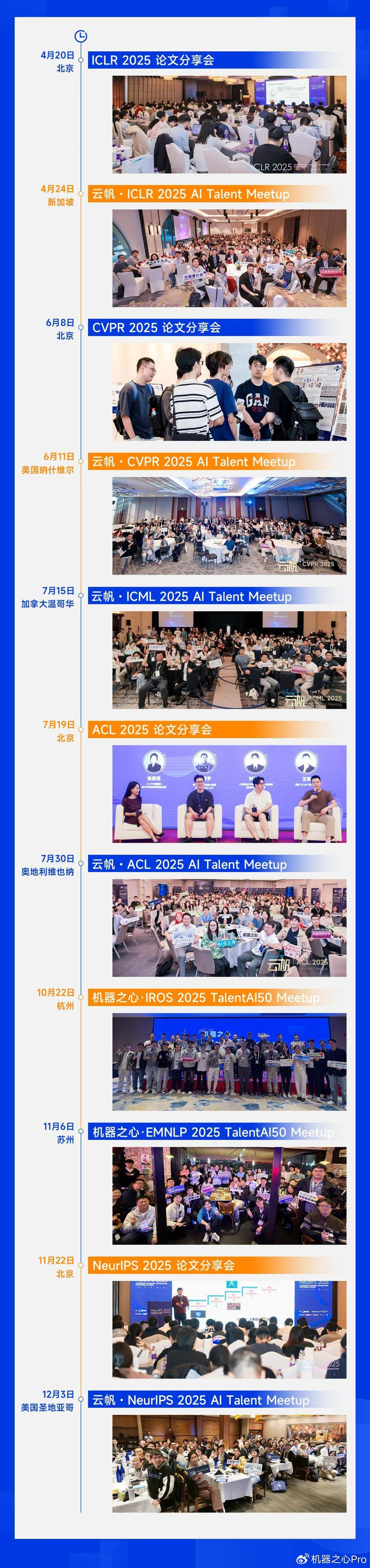 今年,带着这份相信,我们出发了。从北京的四季轮转到江南的桂香满庭,从新加坡的星洲夜语到维也纳的夏风微拂,从温哥华的学术静谧到圣地亚哥的海边星光……我们围绕 ICLR、CVPR、ACL、ICML、IROS、EMNLP、NeurIPS 等 AI 学术会议,跨越 8 座城市,落地 11 场活动。