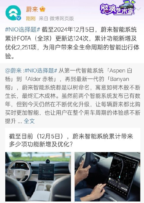 蔚来:截至2024年12月5日,蔚来智能系统累计FOTA(全球)更新达124次,累计功能新增及优化2,251项