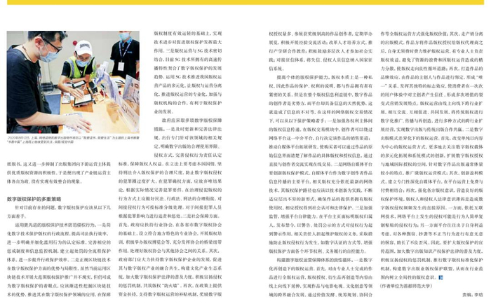 再次,在政策上提供资金扶持,支持数字版权运营的补贴机制,奖励数字版权授权量多、参展获奖级别高的作品创作者,定期举办展览,积极开展经验交流活动;改革人才培养方式,推行产学研合作教育;积极鼓励多层次人才参加社会实践;对接征信体系,将失信、侵权人员信息纳入国家征信系统。