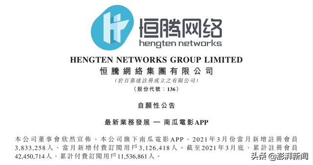 4月22日,恒腾网络发布公告,旗下流媒体平台南瓜电影2021年3月新增注册会员383.3万人,新增付费用户312.6万人。截至3月底,累计注册会员4245.1万人,付费用户1153.7万人。此前,恒腾网络发布公告,南瓜电影将与腾讯视频深度合作,获取腾讯视频独家版权的海量影视作品授权,成为行业焦点。