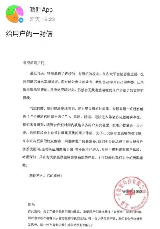 2月13日,啫喱在微博发布了一封“暂别信”。信中称,他们遭遇了“连续的、有组织的攻击”“在各大平台被恶意造谣”“在应用商店被水军刷差评”,同时还就“未经用户授权获取隐私”的网传消息报了警。