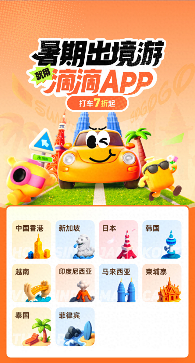 随着暑期旅游旺季开启,探亲访友、家庭结伴出游需求持续走高,跨境游市场呈现爆发式增长。为让国人跨境出游享受更方便、更优惠的打车服务,滴滴推出暑期打车7折起活动,覆盖中国香港地区和韩国、新加坡、马来西亚等9个国家。