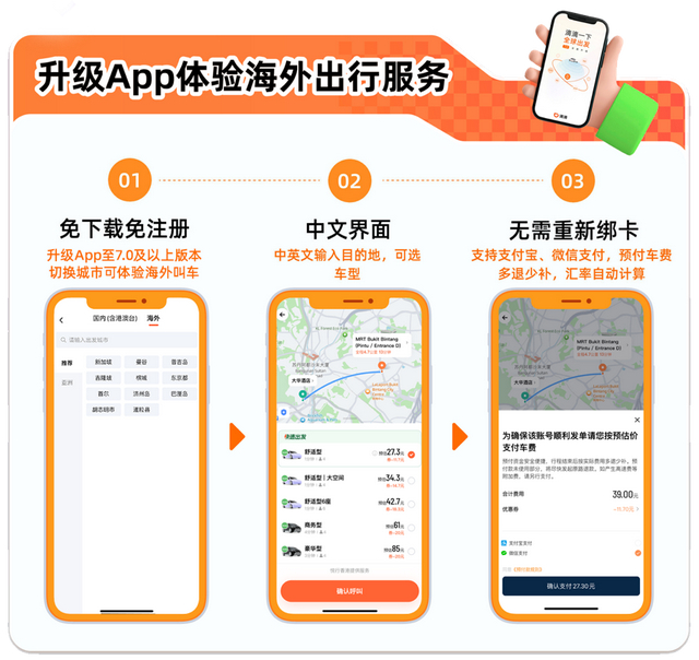自滴滴海外出行上线以来,已持续在春节、五一、端午等多个假期为用户跨境出游提供便捷、实惠的出行服务。在使用上也非常便捷,用户无需额外下载或注册其他打车软件,将滴滴App升级至最新版,点击左上角切换城市,选择海外城市;或在海外出行开通服务城市自动定位,即可体验丝滑的打车服务。海外出行还支持用中英文输入起、终点;支持使用支付宝、微信预付车费,汇率自动计算;用户可在App内用中文和司机即时沟通,支持中文客服,让用户不再为语言障碍感到发愁。