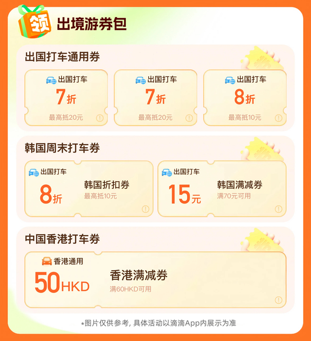 即日起至7月31日,用户打开滴滴App或小程序进入海外出行活动页面,可领海外打车专属券包,包含2张7折券,每张最高减20元以及1张8折券最高可抵10元;去往韩国旅游的用户可领2张韩国专属打车券,包含1张满70元减15元券和1张8折最高抵扣10元券,限周六日可用;去往日本的用户可以通过兑换码OTOKU兑换10张优惠券,单笔订单最高减500日元;订单起点或终点在东京国际机场、成田国际机场、关西国际机场的订单可享7折起优惠,单笔订单最高减1500日元;去香港游玩的用户可领最高减50港元的优惠券。此外,用户可参与抽奖赢好礼活动,每人每日有2次抽奖机会,奖品包含打车折扣券、立减券等,不同国家或地区可享不同优惠,用户可进入活动页面查看具体优惠详情。