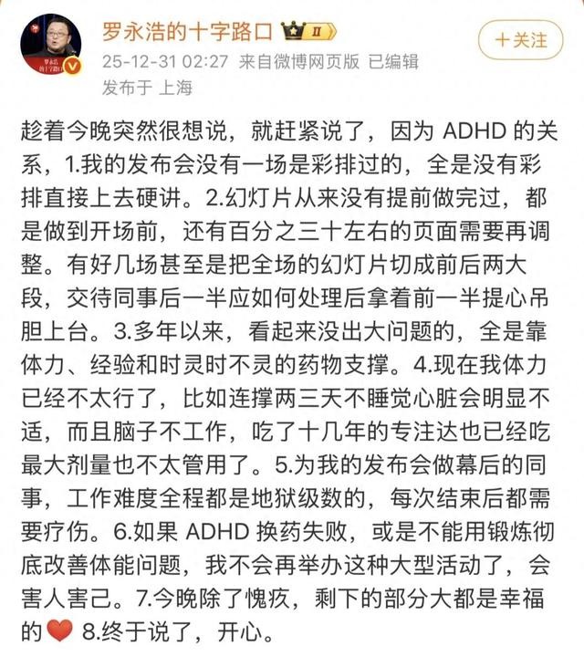 图源:微博@罗永浩的十字路口 12月31日凌晨,罗 永 浩在个人微博回应 “科技春晚”迟到40分钟: 因为ADHD(注意缺陷与多动障碍)的关系,发布会没有一场是彩排过的,全是没有彩排直接上去硬讲。幻灯片从来没有提前做完过,都是做到开场前,还有百分之三十左右的页面需要再调整。如果ADHD换药失败,或是不能用锻炼彻底改善体能问题,不会再举办这种大型活动了,会害人害己。