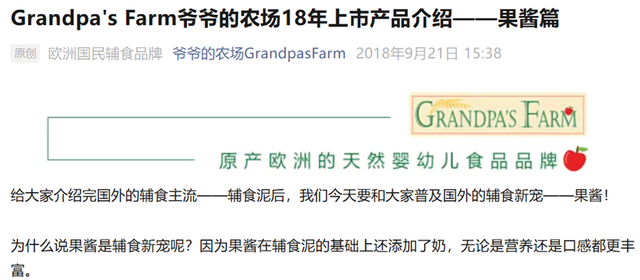 据微信公众号“爷爷的农场GrandpaFarm”发布的消息,早期该账号发布的文章基本会添加“欧洲原装进口”和“原产欧洲的天然婴幼儿食品品牌”的宣传口号。