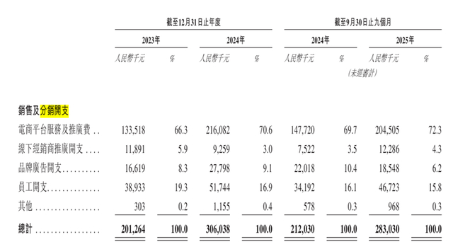 为维持品牌影响力与销售增长,公司投入巨额营销费用,且增速持续高于营收增速。招股书数据显示,2023年、2024年和2025年前9月,公司实现营收6.22亿元、8.75亿元和7.8亿元;同期,销售及分销开支分别为2.01亿元、3.06亿元、2.83亿元,占营收比例从32.3%攀升至35%,进一步增至36.3%。