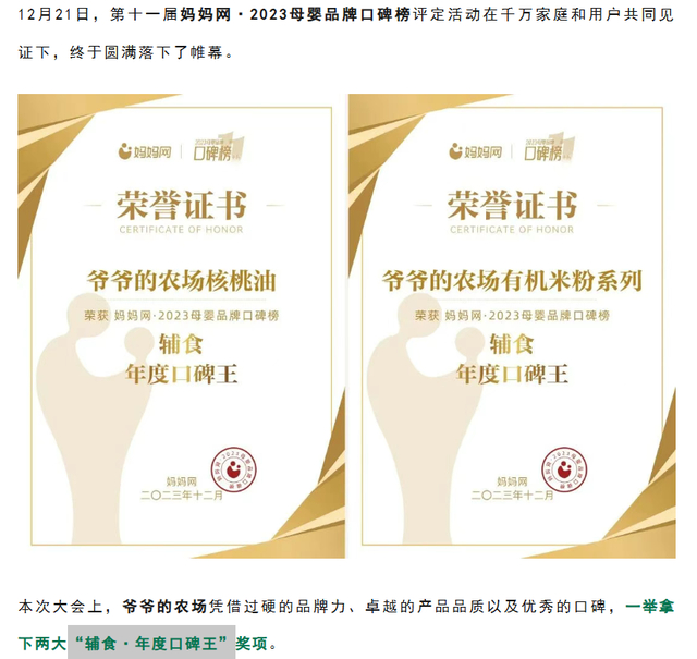 澎湃新闻注意到,自爷爷的农场成立以来,在妈妈网的母婴品牌口碑榜中,爷爷的农场多次斩获奖项,而品牌则将这些获奖情况广泛用于自身宣传渠道及媒体推广。