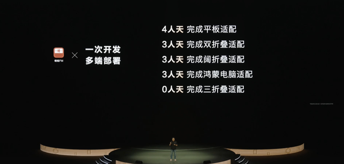 以蜻蜓FM为例,完成开发后,仅4人天工作量就完成了对鸿蒙平板的适配,3人天完成双折叠适配、3人天完成阔折叠适配、3人天完成鸿蒙电脑适配、0人天完成三折叠适配。代码复用率高,加上多端模拟器一次修改多端呈现的特性,令鸿蒙操作系统跨平台适配效率极高。