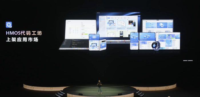 (图源:发布会现场)华为考虑到了开发者加入鸿蒙大家庭的困难,通过一次开发多端部署的特性,以及提供的DevEco CodeGenie、开发者文档、HMOS代码工坊,帮助开发者缩短应用开发周期和降低开发成本,并便于向其他平台适配移植,实现了开发成本1+1+1<2的效果。