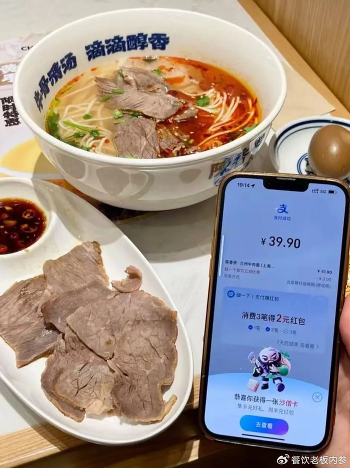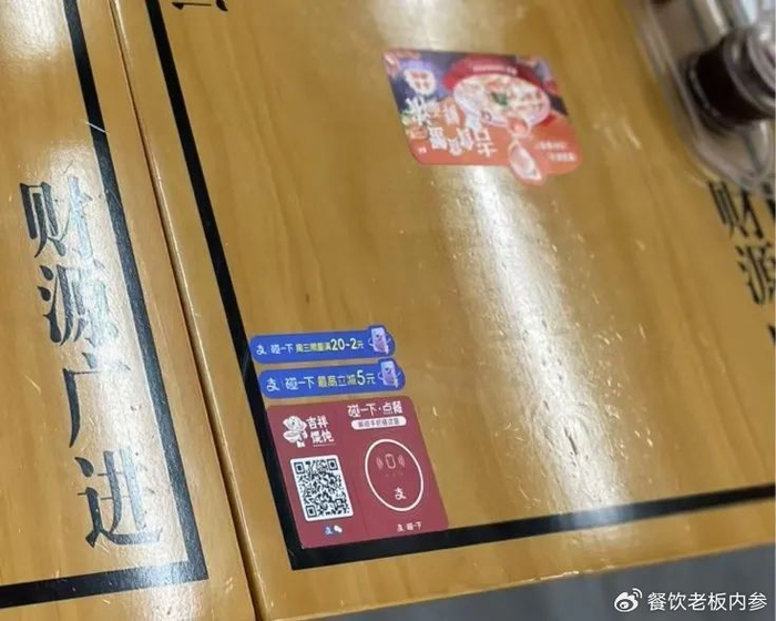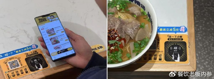 据媒体报道,不少头部品牌已经上线碰一下点餐服务。例如,在全国拥有超270家门店的兰州牛肉面头部品牌陈香贵已全面上线“碰一下点餐”,支付宝用户只需解锁手机,轻轻触碰餐桌上的智能点餐桌贴,即可迅速跳转至陈香贵小程序进行点餐。
