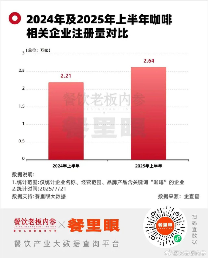 从今年上半年的大盘数据来看,这场战争并未结束。咖啡门店数量仍在猛涨。企查查数据显示,截至7月21日,今年已注册近3万家,其中上半年注册量达2.64万家,同比增长19.54%。
