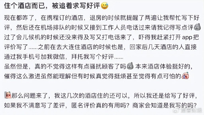 “方便的话给个好评。”似乎已成为不少酒店前台的“口头禅”。