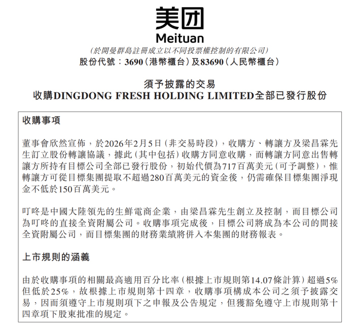 2月5日,美团在港交所发布公告,宣布拟以7.17亿美元收购中国大陆领先生鲜电商企业叮咚买菜的全部已发行股份。根据协议,转让方可从叮咚买菜提取不超过2.8亿美元资金,但需确保其净现金不低于1.5亿美元。收购完成后,叮咚买菜将成为美团间接全资附属公司,其财务业绩将并入美团财务报表。