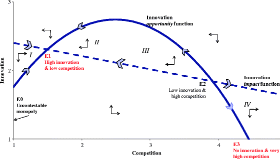 熊彼特认为创新需要市场力量,因为当企业有了市场力量,就可以赚取大量的利润,就可以规划长远,而竞争会削弱创新;但是肯尼斯·阿罗则认为竞争者更有创新动力,因为垄断者创新经常会得不偿失——自己成功了,也不过是原地踏步,即便是失败了,如果竞争者没有成功的话,依然保有垄断地位。