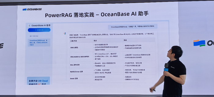 OceanBase公有云高级产品专家冯礼在会上称,在 AI 落地中,RAG(检索增强生成)是企业优先采用的核心场景,通过知识库、知识检索与大模型结合,解决大模型 “幻觉” 问题,使其基于企业内部数据作答。