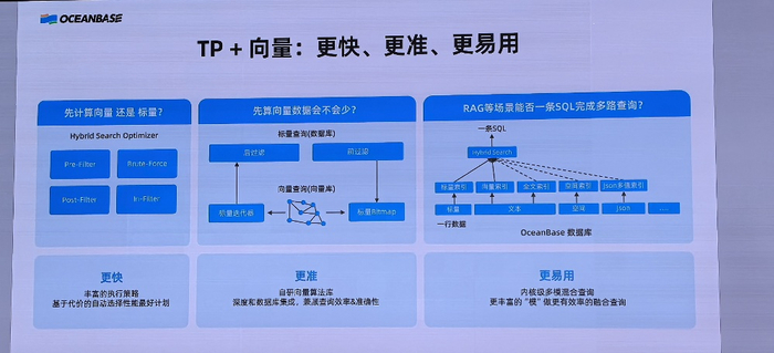 OceanBase副总裁、公有云事业部总经理尹博学将OB Cloud的AI能力优势总结为四点,分别是具备天然的一体化架构,一套数据库支持事务处理(TP)、实时分析(AP)、AI工作负载,用户面向AI无需引入额外技术栈;多模向量一体化,原生支持向量、标量、空间、文本等多模数据的混合检索,简化AI应用复杂度;提供开箱即用的RAG服务,“0门槛”构建现代RAG应用;Bring AI to Data,一体化架构实现数据的新鲜度与智能的实时性融合。