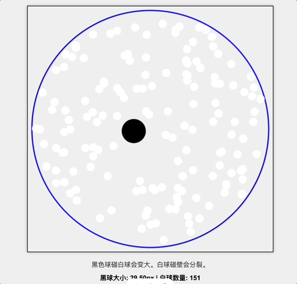“一个圆里面有两个小球,一个黑色,一个白色,白色的球随即位置自由下落,碰到边界会反弹,同时再生成一个随机位置的白色小球,黑色小球碰到边界会反弹,碰到白色的球会变大一点,请模拟一下。”