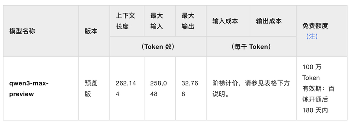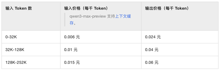 由百炼平台可知,在定价方面,Qwen3-Max-Preview支持256k上下文,根据输入token数采取阶梯计费:
