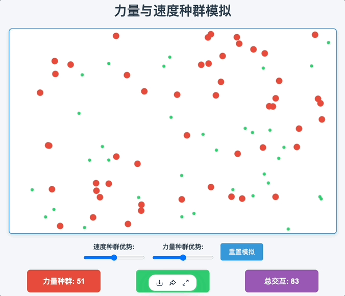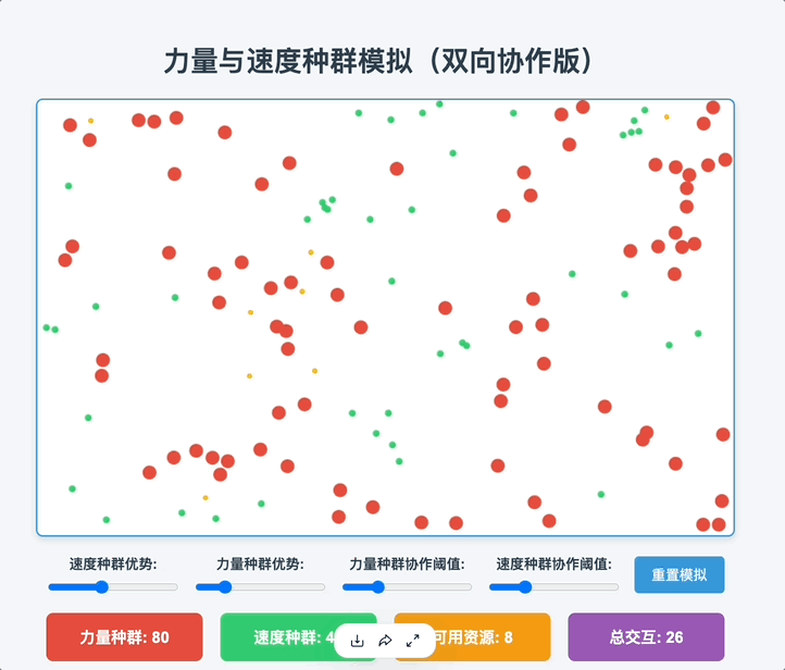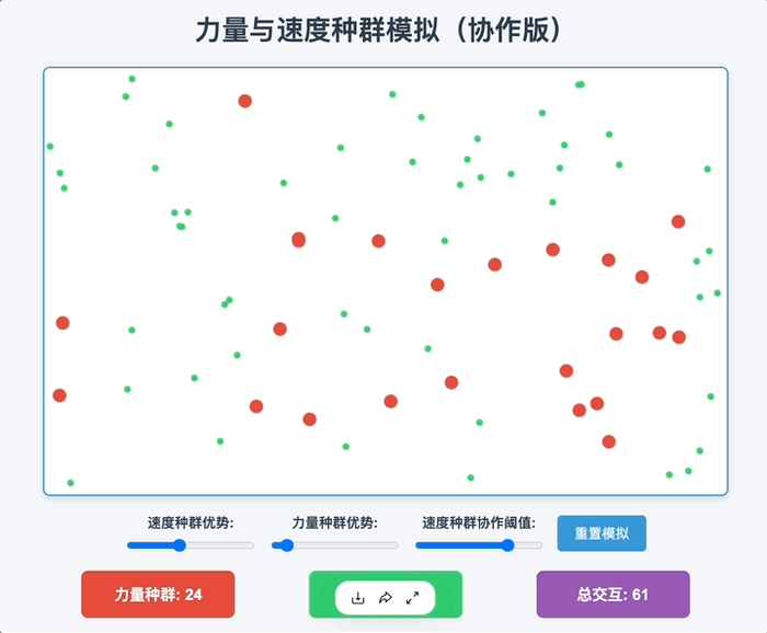 Qwen3-Max-Preview依然能够很好的实现,输出了“力量与速度种群模拟(协作版)”,模拟出小绿球有了协作能力后能抵御红球的能力,但双方态势依然很僵持。
