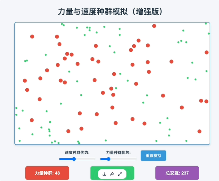 而后,Qwen3-Max-Preview输出了以下“力量与速度种群模拟(增强版)”,准确模拟出了具有躲避危险能力的小球,出现“谁也干不掉谁”的状况。