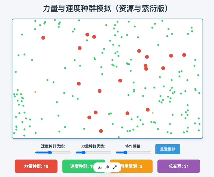 在上述模拟中,我发现速度型种群被干掉的太快了,于是进一步希望它们能够具备“逃跑”能力。我输入提示词:“注重速度的种群被干掉的太快了,他们每个个体都应该具备一定的躲避危险的能力。”