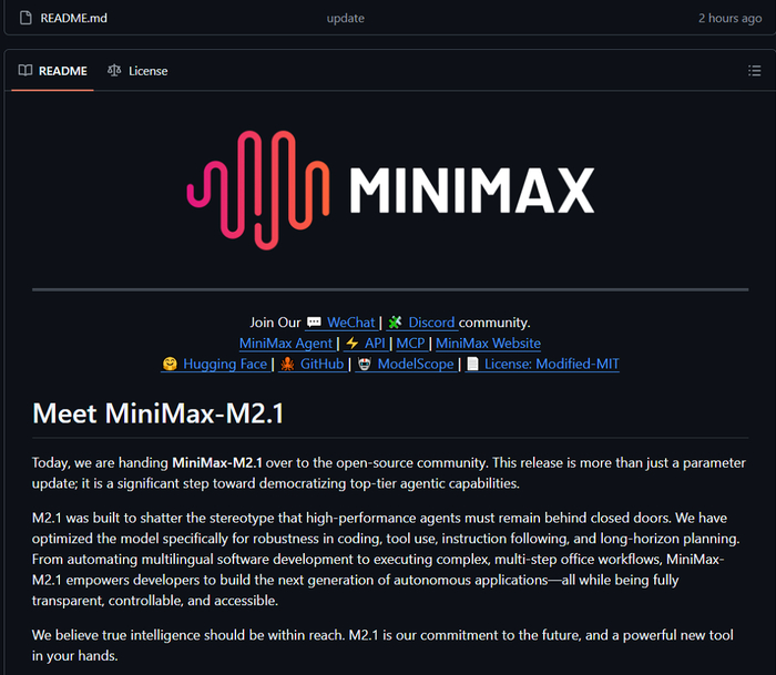 其实,发布之初,MiniMax就宣布MiniMax M2.1模型将会开源,过去几天,MiniMax在与多个部署平台对齐测试,并于今天全面开源权重。