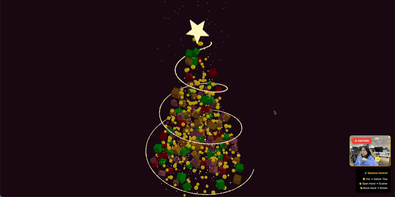 官方案例中,MiniMax M2.1基于React Three Fiber与InstancedMesh构建了一颗“3D梦幻圣诞树”,成功渲染7000+实例,支持手势交互与复杂粒子动画。可以看到,这颗“圣诞树”能根据用户的手势散开或者聚拢,页面效果流畅。