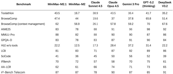 在办公场景、长程工具调用和综合智能指数上,MiniMax M2.1 相比M2也表现出稳步提升,多项得分打平或超过Claude Sonnet 4.5和Gemini 3 Pro。